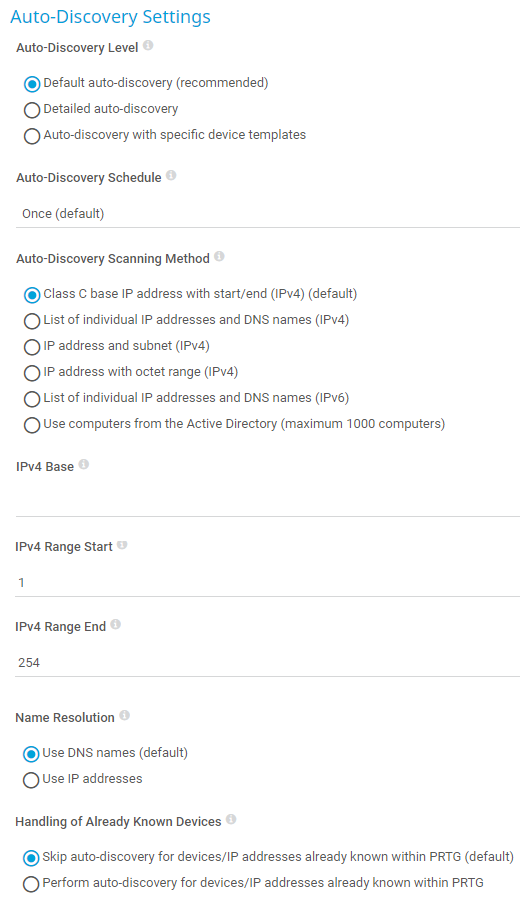 Once (default): Run the auto-discovery only once. PRTG adds new devices and sensors once. If you select this option, you must manually start the auto-discovery.