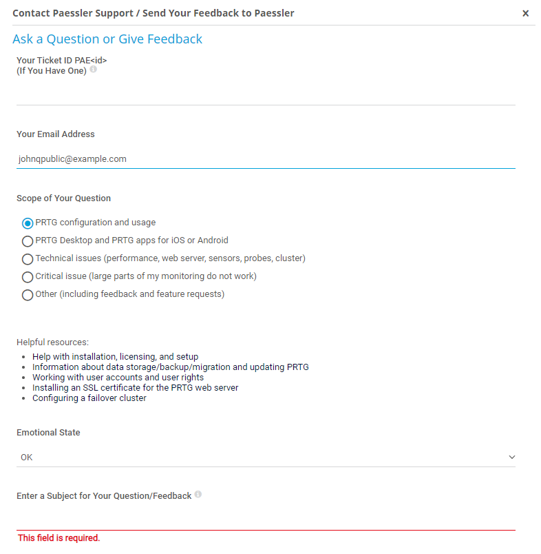 On the other hand, you can use this form to give us feedback. Help improve PRTG by providing criticism, praise, bug reports, and feature requests. Any comments are welcome. Your feedback is handled directly by the Paessler support team.