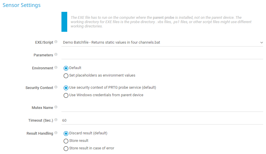 Store result: Store the last sensor result in the \Logs\sensors subfolder of the PRTG data directory on the probe system. The file names are Result of Sensor [ID].txt and Result of Sensor [ID].Data.txt. This setting is for debugging purposes. PRTG overwrites these files with each scanning interval.