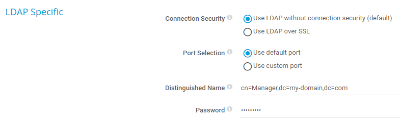 • Use default port: Use the default port. This is port 389 for unsecure connections and port 636 for secure connections.