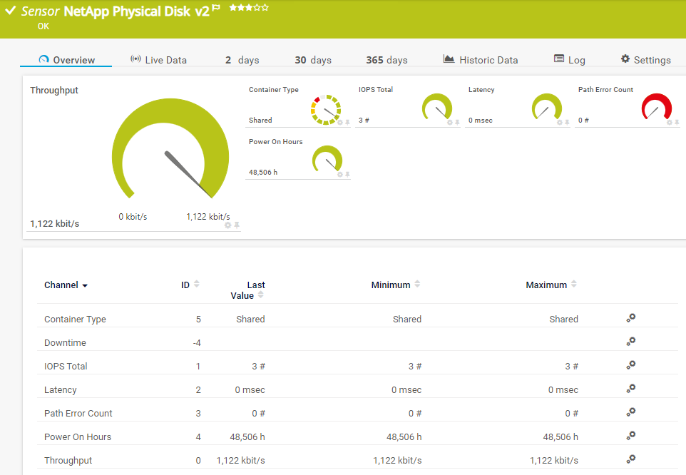 The NetApp Physical Disk v2 sensor monitors physical disks of a NetApp storage system via the Representational State Transfer (REST) application programming interface (API) using ONTAP as of version 9.9.