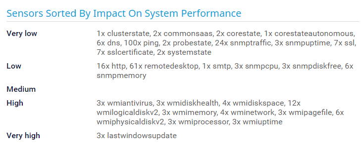 This section shows all sensors that you use in your configuration in order of performance impact (from very low to very high). If the CPU load of the probe system is very high, you can see which sensors might be causing this issue. Consider the recommended number of sensors in the respective sections for sensors with a high or very high performance impact.