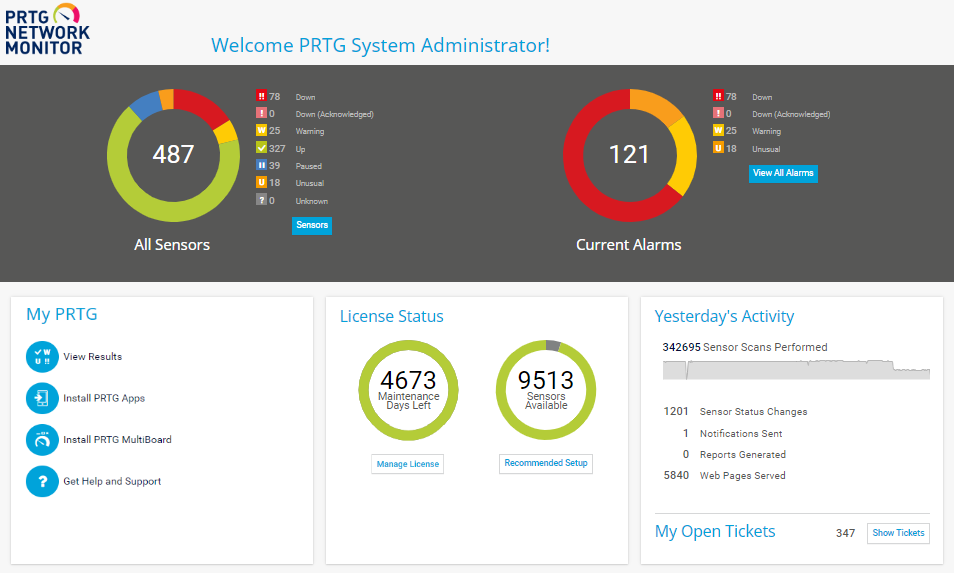 The Welcome page displays various information about your PRTG installation and is similar to a dashboard. It keeps you informed about all sensors and alarms:
